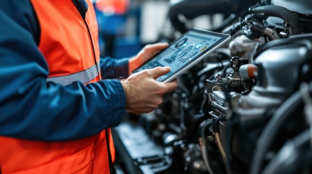 Technician Using Augmented Reality Tablet For Engine Diagnostics Images