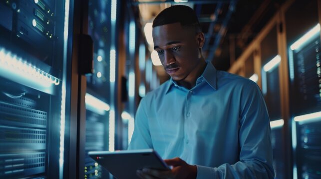 A focused IT professional uses a tablet in a dimly lit server room