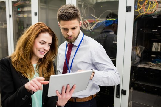 Technicians using digital tablet while analyzing server