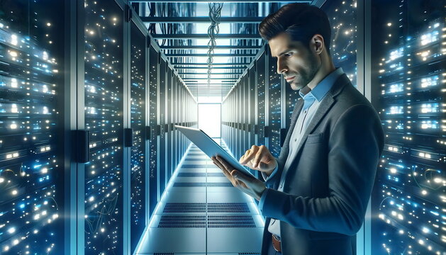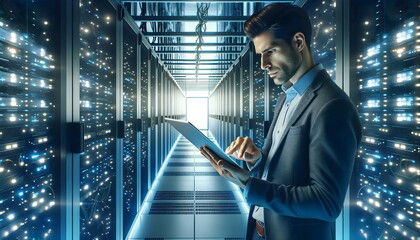 It technician using tablet in dim server room environment