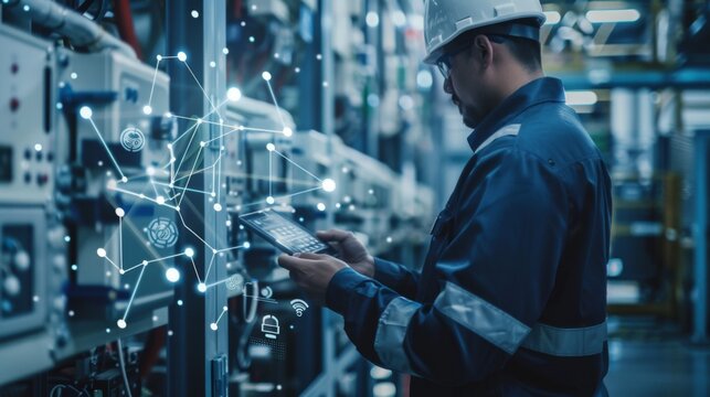 Engineer with digital tablet overlaying network data at manufacturing plant.