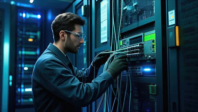 Technician connecting cables in network infrastructure setting