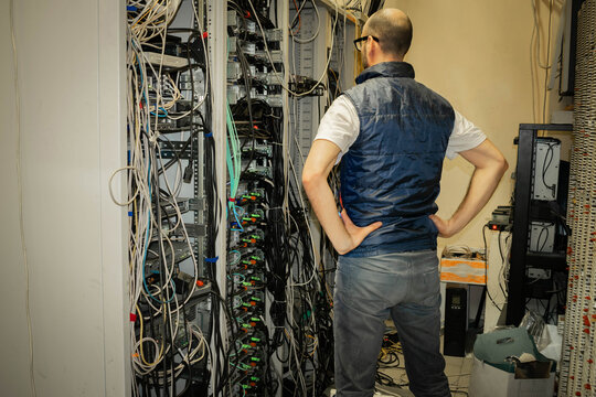 A technician looks at a rack of server equipment, viewed from the back. A man with his hands on his belt is thinking about how to solve a problem in a data center.