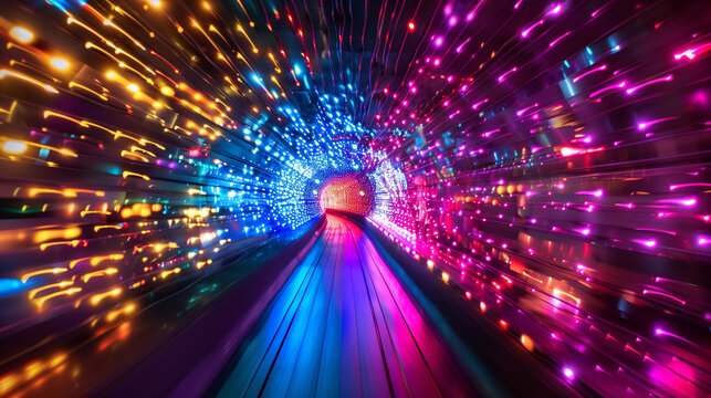 Neon light tunnel reflection in vibrant technicolor with futuristic illumination and colorful glow for modern art and dynamic visual experience