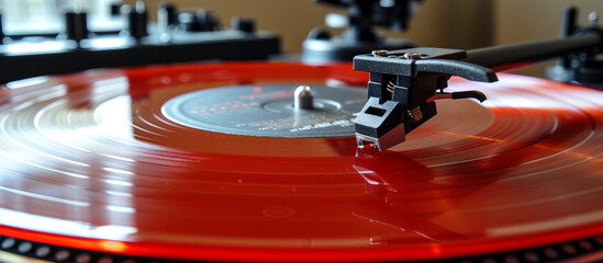 The needle of a turntable delicately positioned on an orange vinyl record, symbolizing the blend of retro and modern music technology