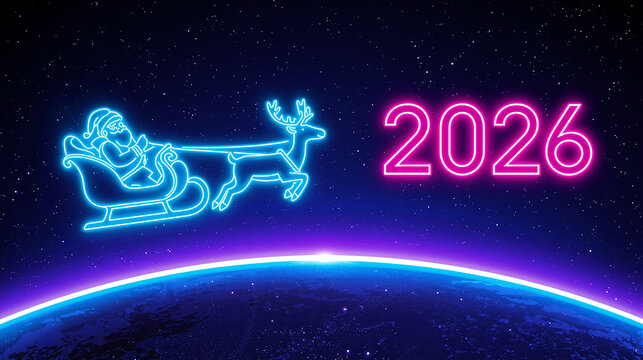 Futuristic Santa Claus Sleigh with Reindeer and Neon 2026 Sign in Space