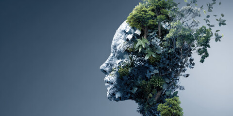 Human face is creatively formed from lush green foliage and various plants, symbolizing connection between nature and humanity. serene expression evokes sense of harmony and sustainability
