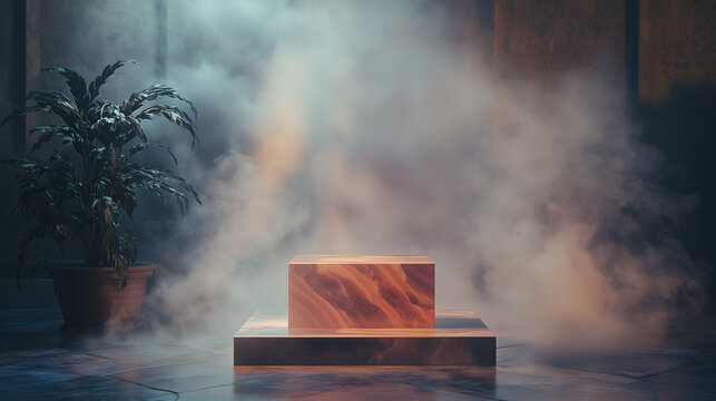 A mystical altar shrouded in fog, highlighted by soft lighting, surrounded by lush greenery and an air of mystery
