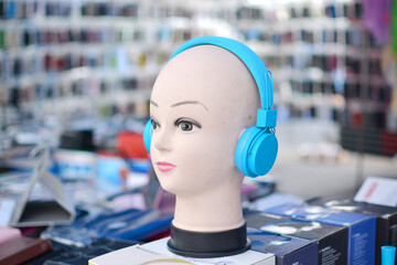 Mannequin head with blue headphones at a flea market, all kinds of stuff in the background, Amsterdam