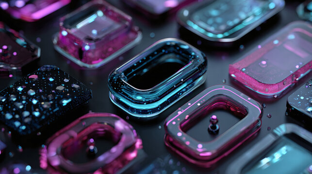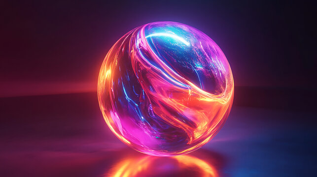 A hyperrealistic 3D render of an AI glass orb, technologic, fluid, beautiful, dynamic looking, neon lights, colors: orange, red, purple, blue and pink.