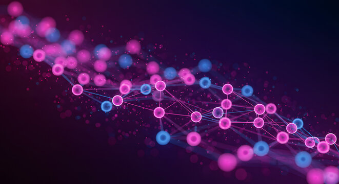 A vibrant abstract design featuring glowing pink dots and lines on a dark background, suggesting a digital or technological theme.