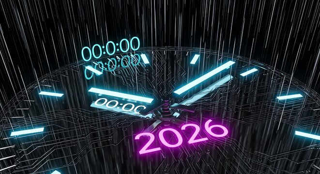 Futuristic Digital Clock Showing Year 2026 on an Illuminated Circuit Board Countdown