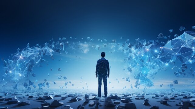 low-poly man stands against a technological blue background