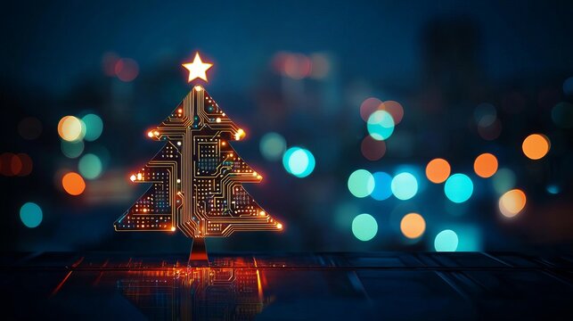 Futuristic circuit board Christmas tree glows with vibrant lights, evoking modern holiday celebration and technological innovation