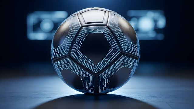 Futuristic digital soccer ball with glowing blue circuit board patterns on a dark background, evoking abstract energy and technological innovation