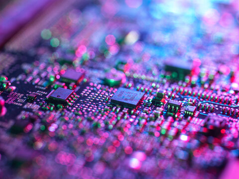 Macro view of circuit board patterns, abstract technological seamless texture.