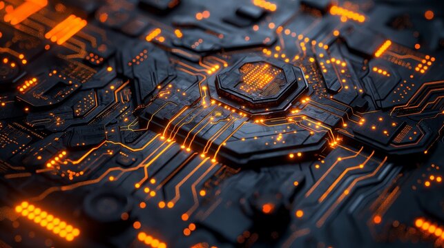 A highly detailed technological landscape, glowing with orange circuitry on a dark base, showcasing the complexity of modern electronics.