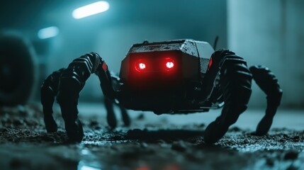 A mechanical spider featuring glowing red eyes, showcasing an advanced design and technological prowess in a gritty, industrial environment.
