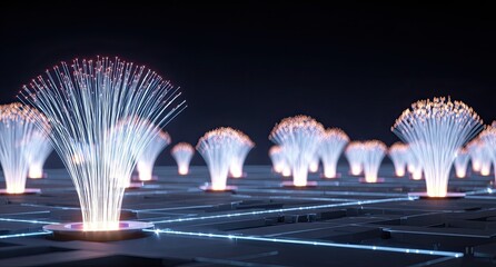 Abstract digital landscape with glowing fiber optic trees