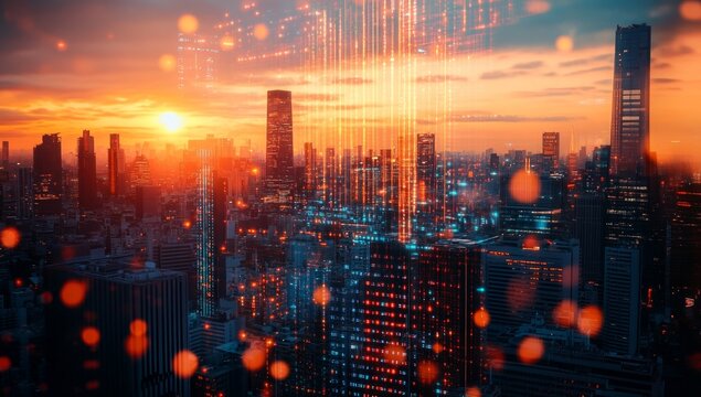 Futuristic cityscape at sunset, overlaid with digital data streams.  Vibrant colors and illuminated buildings create a dynamic, technological image