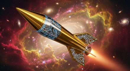 Golden rocket with circuitry design in space, symbolizing technological advancement and space exploration, perfect for a tech or science concept