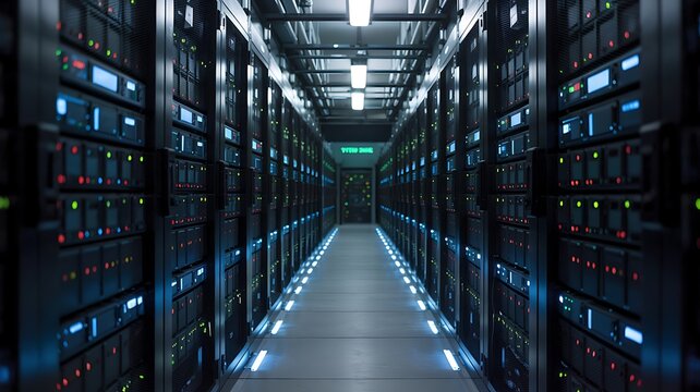 Illuminated rows of technological hardware cabinets stretch down a dark interior corridor