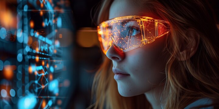 Technician wearing safety goggles examining holographic interface with neon green data