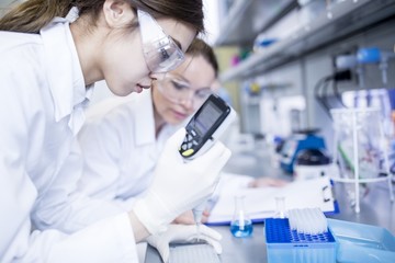 Lab assistants using pipette