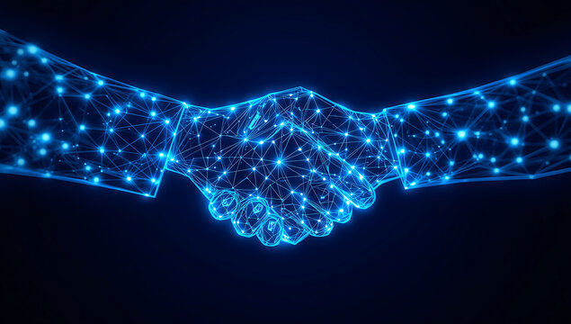 digital handshake agreement with glowing network connection symbolizing partnership and technological advancement.