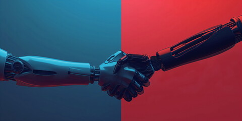 Robotic hands shaking in contrasting red and blue lighting, unity and technological collaboration