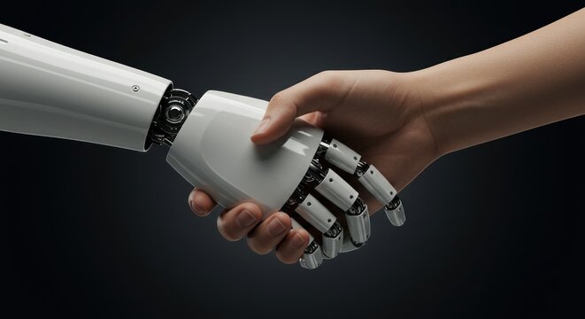 A handshake between a human and a robot, symbolizing collaboration and technological advancement