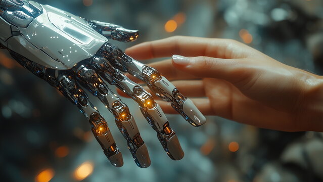 Human and robotic hands shake, symbolizing collaboration and technological advancement