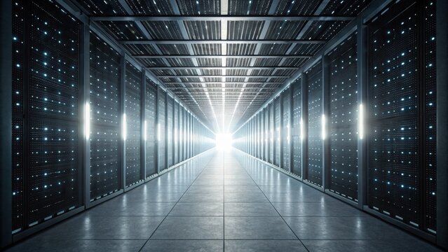 A futuristic corridor of servers illuminated by bright lights, creating a sense of depth and technological advancement.