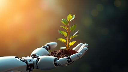A robotic hand gently cradles a small sapling emerging from rich soil in a sunlit natural environment showcasing technological harmony with nature.