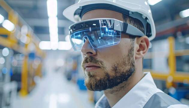Visionary Engineer: A modern engineer immersed in augmented reality, inspecting a complex machinery on the factory floor. Technological innovation and workplace intelligence.
