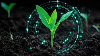 Futuristic Plant Growth Concept with Digital Elements and Soil Displaying Environmental Impact and Technological Innovation in Agriculture