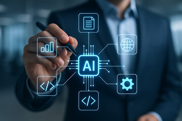 Businessperson integrating artificial intelligence into global operations and data analysis using innovative digital interface for technological advancement and efficiency