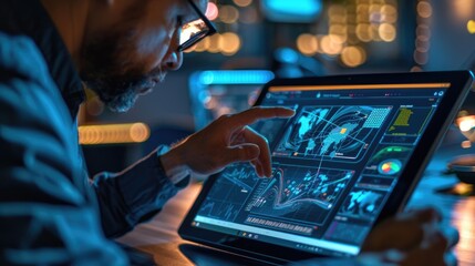 a person using a tablet with futuristic digital icons, showcasing technological advancement