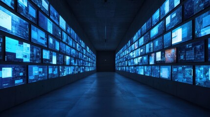 A dimly lit corridor filled with numerous blue screens displaying data and digital interfaces, creating a futuristic and technological atmosphere.
