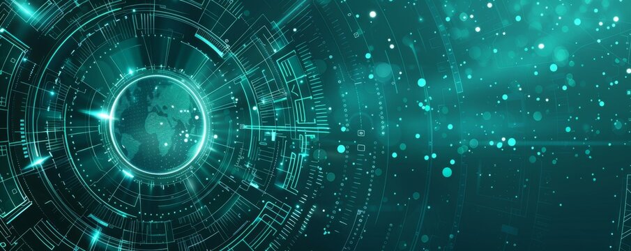 Abstract medical technology interface with geometric patterns in teal and navy gradient, circuit-like lines, digital mesh overlay, military-grade aesthetic