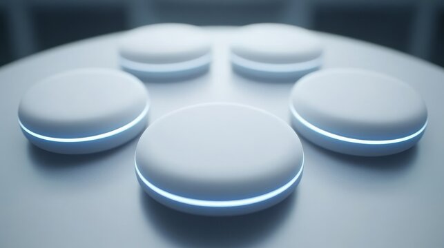 A close-up view of sleek, illuminated circular devices arranged on a surface, suggesting a modern technological interface.