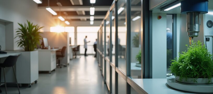 A futuristic office workspace featuring a sleek computer setup with data analytics on display, surrounded by advanced technological elements.