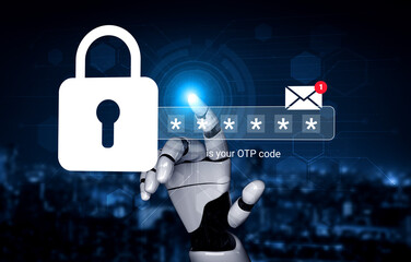 A robotic hand interacts with a digital lock symbol, emphasizing the significance of security and OTP codes in online interactions and technological communications. Gantry