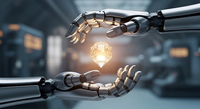 Robotic hands delicately safeguarding a glowing crystalline entity amidst the technological realm