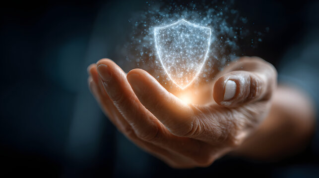 Hand holding glowing digital shield hologram symbolizes cybersecurity and protection. image conveys sense of security and technological advancement, highlighting importance of antivirus measures