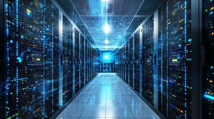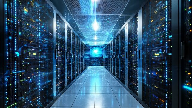 An advanced data center room housing several sleek server racks, vividly illuminated in blue light, representing technological progress, computing, and connectivity.