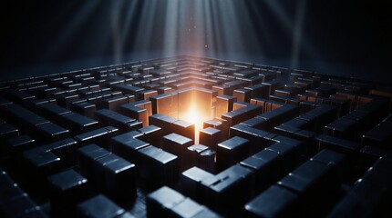 intricate geometric maze with glowing core symbolizing innovation and technological advancement | technology, business, abstract, science, problem solving theme