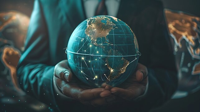 Businessman in a suit holds a glowing globe, symbolizing global connection and leadership in a technologically advanced world.