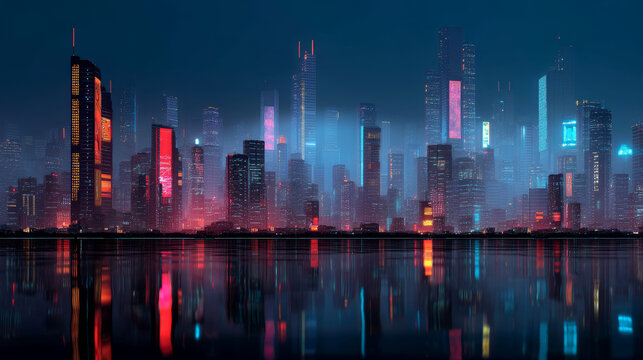 Digital cityscape illuminated by vibrant neon lights, showcasing a futuristic and technologically advanced urban environment.