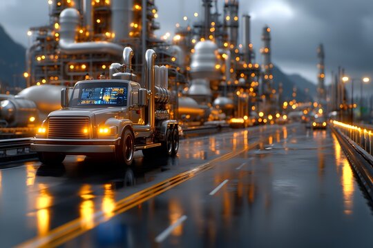 A dramatic chiaroscuro lit cityscape featuring a sprawling technologically advanced oil refinery complex with sleek